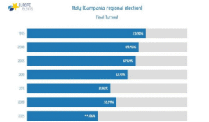 En Campanie , si l’on en croit le ministre de l’Intérieur, sur 5 600 bureaux de vote enregistrés (contre 5 825), le taux de participation s’élève à 8,24 % , contre 11,31 % attendus à la même période en 2020, signe de désengagement dans une région où la compétition politique est intense.